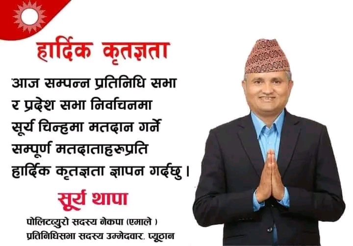 अब प्युठान नगरपालिकाको ८,९ र १० वडाको मत गन्न बाँकी छ तर थापाले बिजयका लागि आवश्यक मत लिइसकेकाले सिधाकुराले उनलाई बिजयी घोषित गरेको छ ।उता अर्घाखाँची बाट नेकपा एमालेका नेता टोपबहादुर रायमाझी प्रतिनिधि सभाका लागि बिजयी भएका छन ।