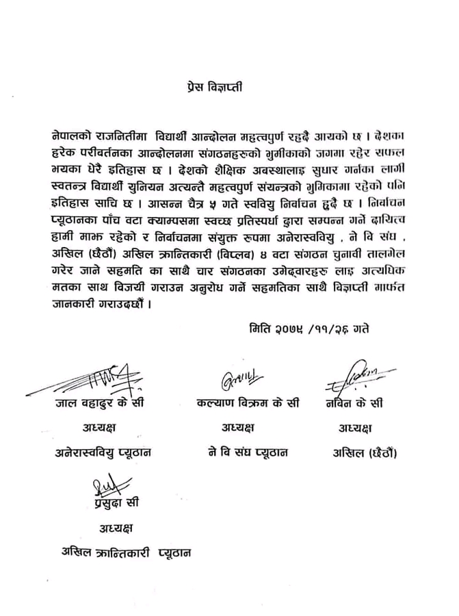 अनेरास्ववियु का जिल्ला अध्यक्ष जाल बहादुर केसी,नेबि संघका कल्याण बिक्रम केसी,अखिल छैठौका नवीन केसी र अखिल क्रान्तिकारी (बिप्लव) का अध्यक्ष प्रसुदा सि को सर्व सहमतिमा बैठक बसि स्ववियु चुनावमा प्यूठान जिल्लाका पाँच वटै क्याम्पस हरुमा चार संगठन तालमेल गरि जाने निर्णय बिज्ञप्तिमा उल्लेख गरिएको छ ।