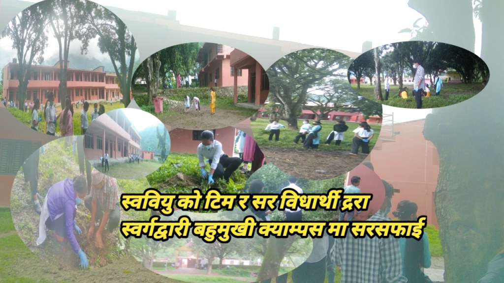 यस प्युठान जिल्ला को पुरानो स्वर्गद्वारी बहुमुखी क्याम्पस मा आज मिति २०८०/०४/१९ गते स्ववियु को नेतृत्व मा शुक्रबार कार्यक्रम मा सरसफाई कार्यक्रम मा स्ववियु टिम र सर विधार्थी पुर्ण रुपमा सहभागी भई सबैले इमान्दार रुपमा सहभागी भाइ यस कार्यक्रममा उपस्थित भैही काम गरेका थिए जसमा मा वृक्षारोपण पनि गरिएको थियो जसमा स्ववियु सदस्य केशर सुनार र सचिव प्रेम बहादुर विश्वकर्मा र सदस्य भुवन केसी कोषाध्यक्ष भुपेन्द्र केसी लगायत सम्पूर्ण स्ववियु टिम उपस्थित र यस क्याम्पस का सरहरु ड ओमहरी भट्टराई , बासु देव अधिकारी सर हरुको को उपस्थित रहेको थियो जसमा वृक्षारोपण मा फुल का विरुवा दालचिनी को जस्ता विरुवा रोपेका थिए