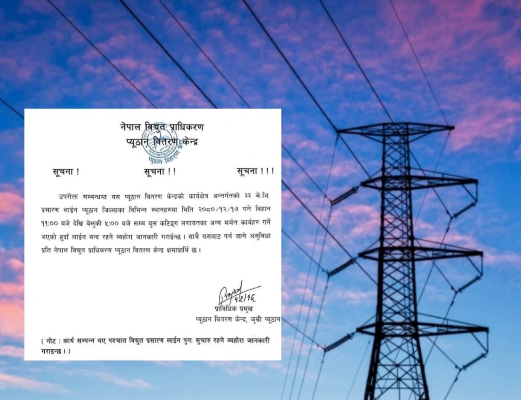 शनिबार प्यूठानमा विद्युत आपुर्ति बन्द हुने ११ बजे देखि साझा ५ बजे सम्म Posted byPyuthan Time'sMarch 29, 2024Posted inUncategorized भुवन केसी;- प्यूठान । चैत १७ गते शनिबार प्यूठानमा विद्युत आपुर्ति बन्द हुने भएको छ । ३३ के.भी. प्रशारण लाईन अन्र्तगत जिल्लाका विभिन्न ठाउँमा शनिबार विद्युत अवरुद्ध हुने नेपाल विद्युत प्राधिकरण प्यूठान वितरण केन्द्रले जनाएको छ । Share this: Share on X (Opens in new window) X Share on Facebook (Opens in new window) Facebook Like Loading... Related